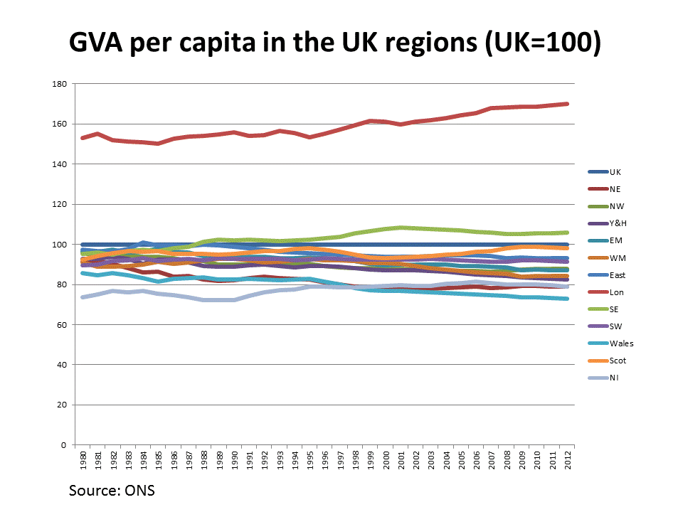 There are significant regional disparities in the UK economy – and this is a major problem, not simply because of equity but also because of efficiency and national economic performance – raising the economic performance of lagging regions would raise the overall growth of the economy. Some picture of the scale of the problem is shown in the chart below. London’s economic performance significantly outstrips the other regions of the UK – in 2011, London’s output per person was nearly 70% higher than the UK average and more than 130% greater than the least productive region (Wales). Furthermore, the extent of regional disparities has been increasing consistently since 1980 – under Conservative, Labour and Coalition Governments.