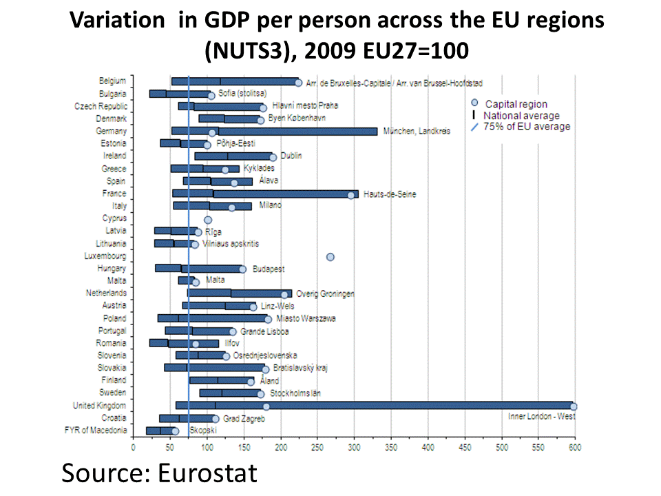 A challenge for the Deputy Prime Minister and Coalition Government is to explain why spatial disparities are so severe in the UK. Globalisation and structural change have had an impact on all the advanced countries – but as the chart below shows, regional disparities (measured at the disaggregated NUTS3 level) are much greater in the UK compared to the other countries in Europe.